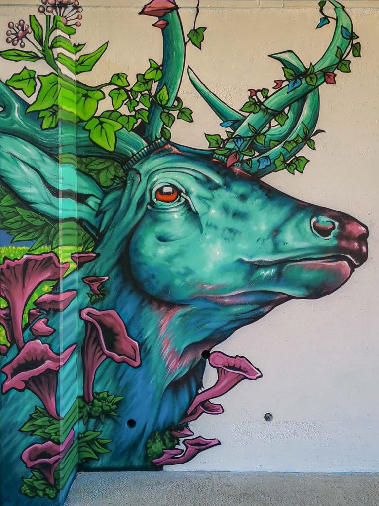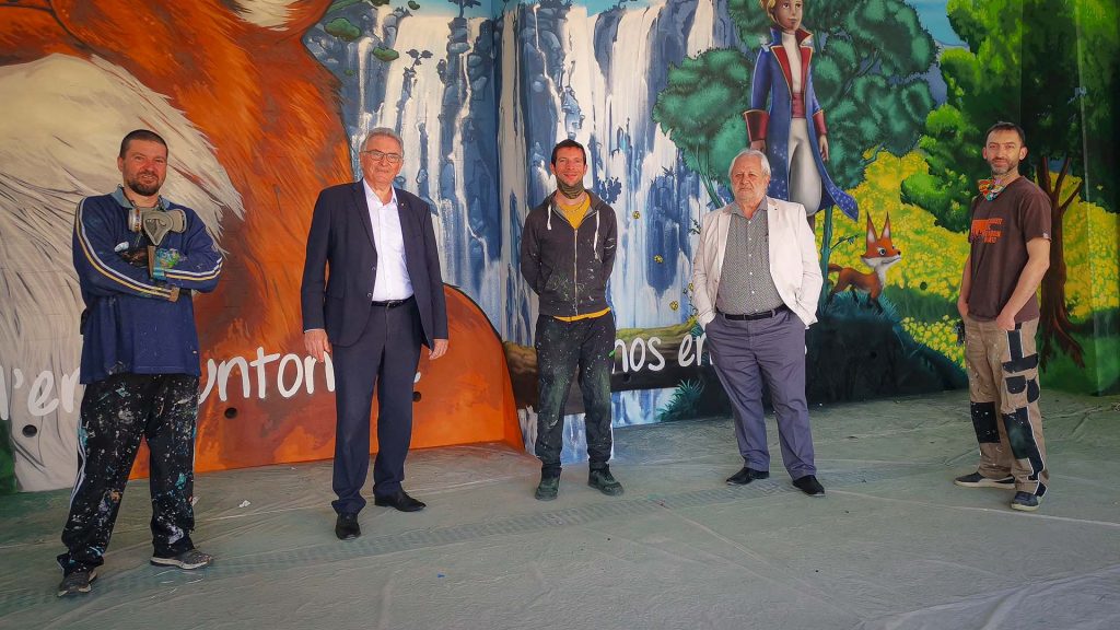 Pendant deux jours, Packe, Monsieur S et Heta One ont peaufiné les détails de cette fresque graffiti ludique de 110 m². Ils ont ajouté les derniers éléments visuels : effets d’herbe en mouvement, dégradés de couleurs sur la cascade, pelage des animaux, détails des fleurs & feuillages…