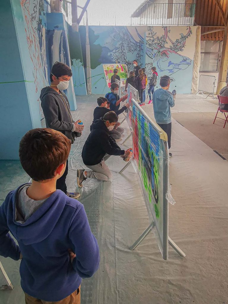 Dès le début, le projet a été pensé pour impliquer les jeunes générations. Pour commencer le projet, les élèves de l’école primaire ont été invités à réaliser des esquisses autour du thème de la Nature. Les enfants, toujours plein d’inspirations, ont imaginés des forêts enchantées, des animaux majestueux… Ces croquis ont ensuite servi de référence aux artistes du collectif qui se sont lancés dans la conception de la maquette finale de la fresque.